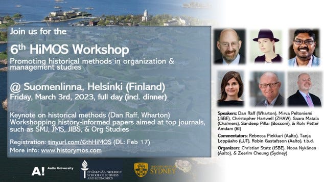 Consider joining us for the next HiMOS workshop (www.historymos.com) in Helsinki. The seminar series aims at promoting historical methods in management and organization studies and workshops history-informed papers for publication in top management journals.