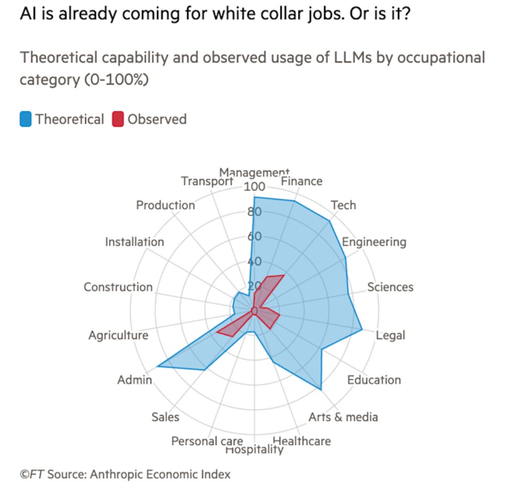 Most papers examining “at-risk” occupations operate on the principle of breaking jobs down into discrete tasks and tracking whether an AI can perform them. But, for the most part, our jobs are not bundles of discrete tasks. Sorry, but simple analytics only get you so far. Also, here is a neat Spider diagram by the FT that will either totally reassure you or give you the willies, depending on what your general inclination is anyway: