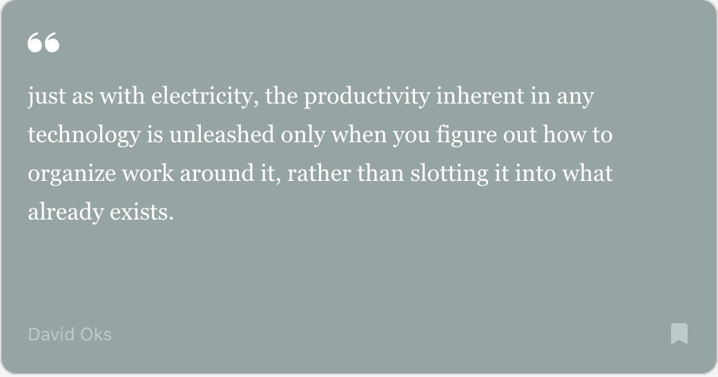 As a historian, you may note many a tortured analogy with past technological revolutions. Electrification and the introduction of spreadsheet software are popular — see the AI as Normal Technology and a previous post here. But the prize for best recent historical analogy certainly goes to David Oks’ elaboration of bank tellers — ATMs — the iPhone. (Worth a read! Click the image below for the full post.)
